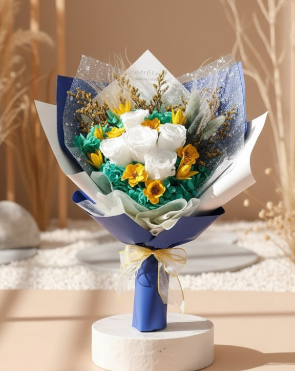 This preserved bouquet brings together a pure white rose, sunny yellow wax flowers, lush green hydrangeas, cheerful yellow caspia, and fluffy bunny tails. A fresh, uplifting palette that stays beautiful for years—perfect for brightening any space or gifting from the heart.